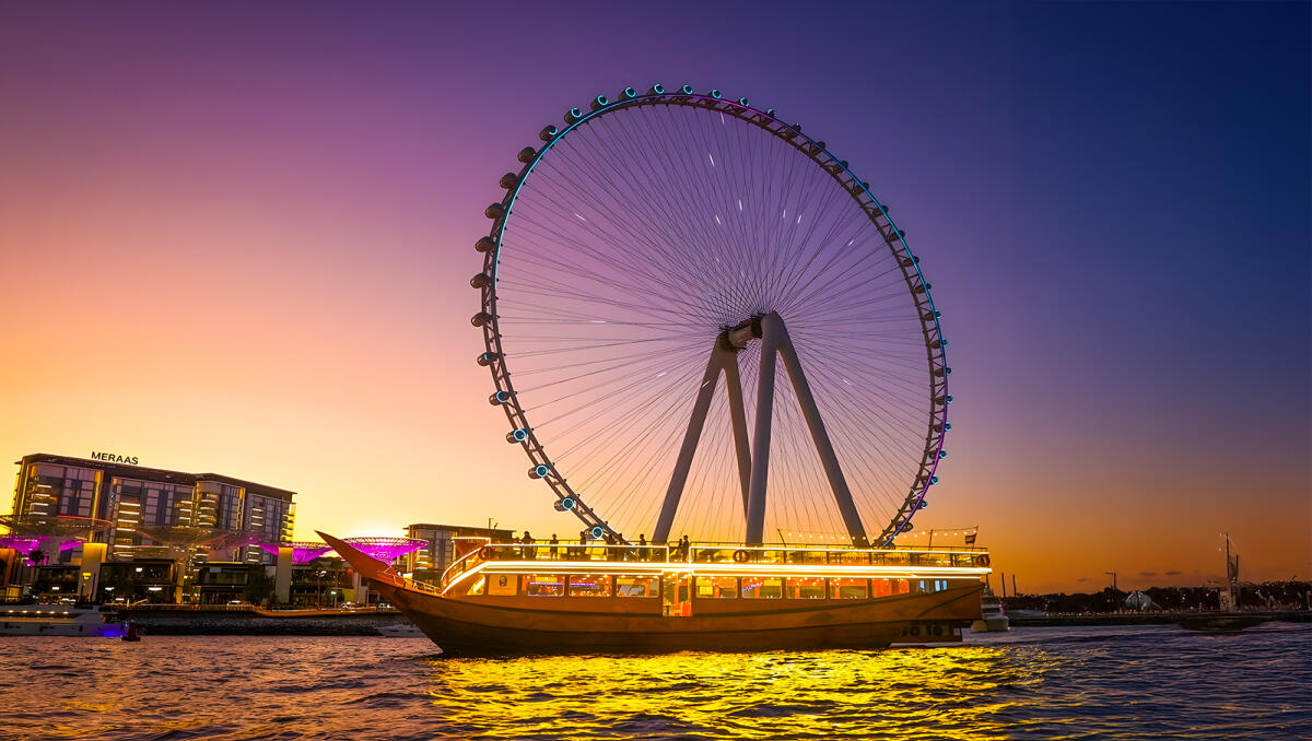 - Feast on an international buffet with Arabic and global flavors as you glide past Bluewaters Island, Ain Dubai, and the Jumeirah Beach skyline.