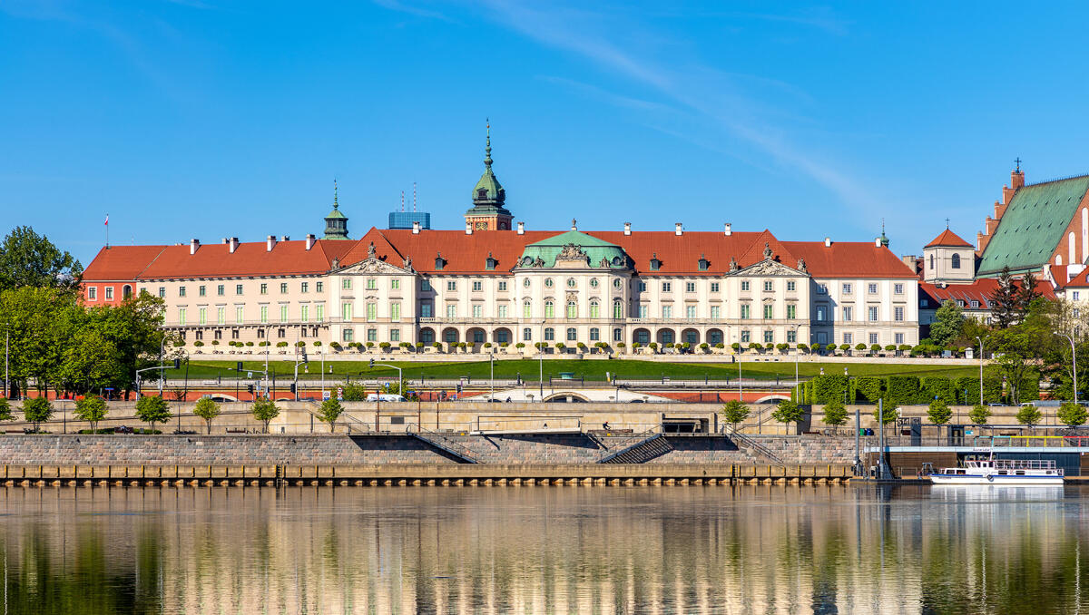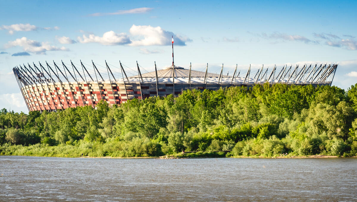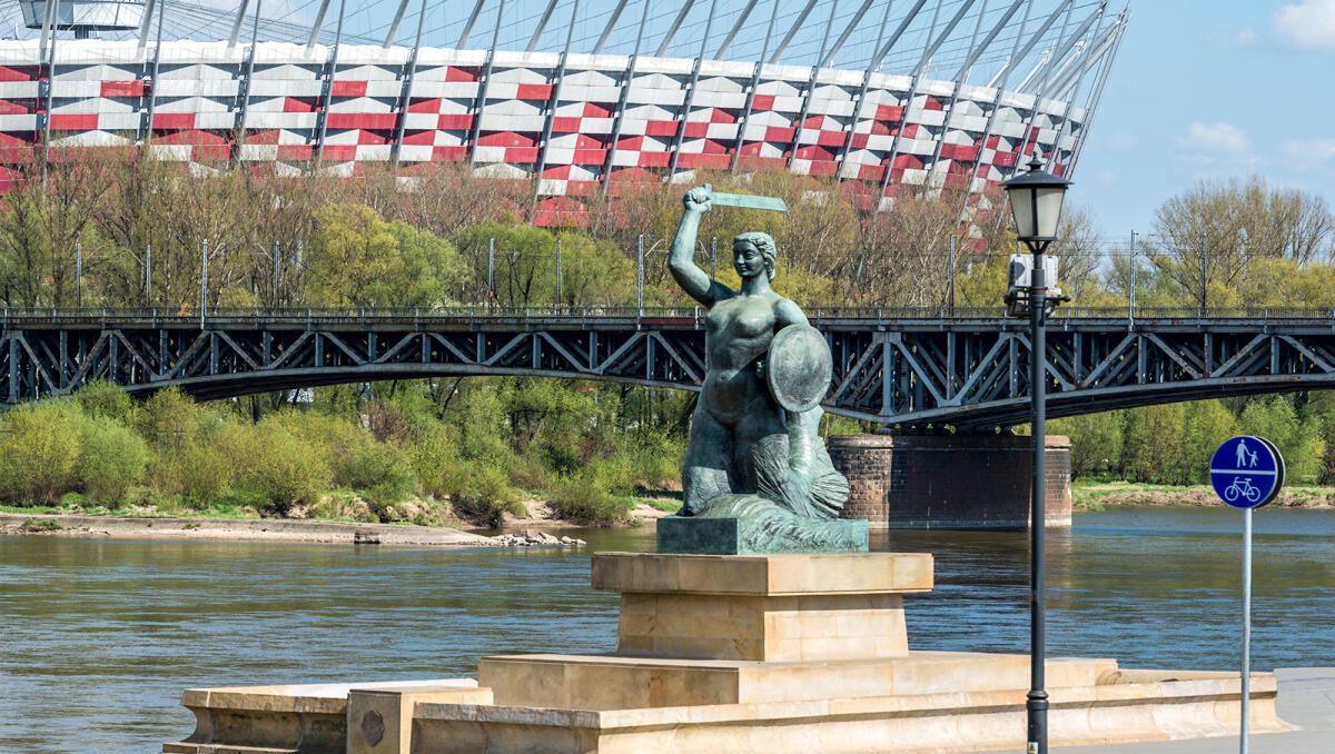 Spot the legendary Warsaw Mermaid or 'Syrenka', armed with a sword and a shield in contrast to her peaceful counterparts worldwide, a symbol of the city's resilience. Witness the panoramic contrast of the old and new town, the monumental National Stadium, and the serene green spaces nestled along the right bank of the Vistula, one of the last wild rivers in Europe.