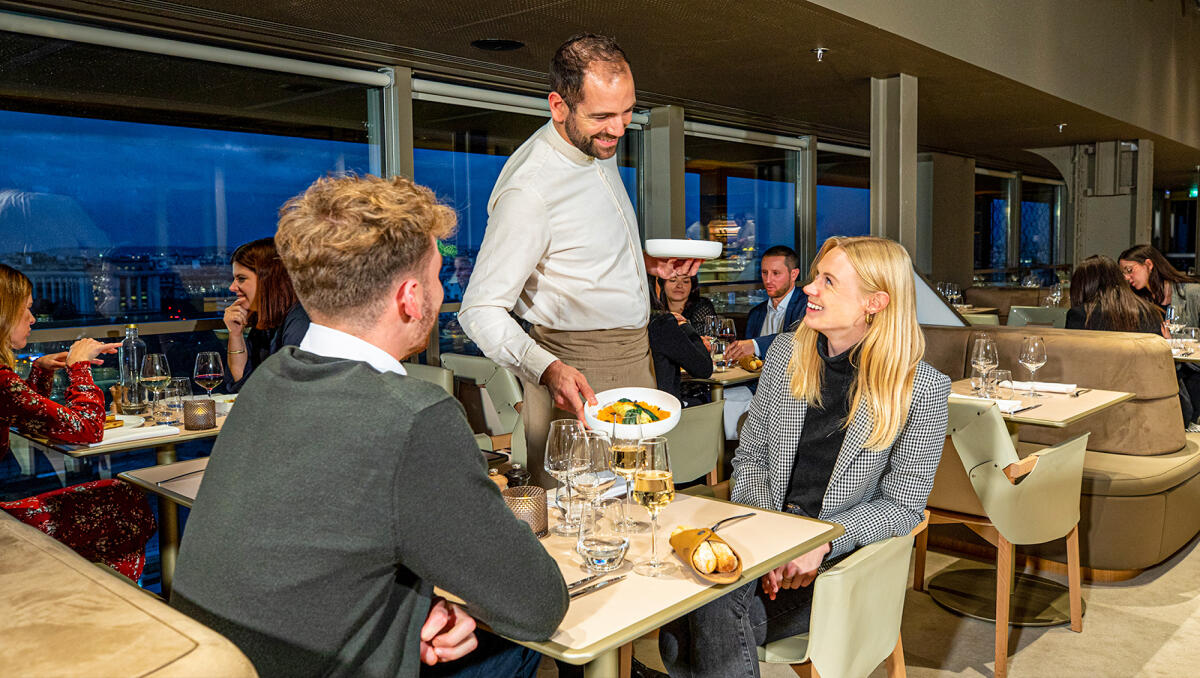 Enjoy an elegant gourmet dinner at Madame Brasserie on the Eiffel Tower’s first floor with stunning city views. With elegant French art gracing the walls and large windows revealing stunning views of the City of Light, the restaurant showcases charming Parisian-style décor for an exquisite dining atmosphere.